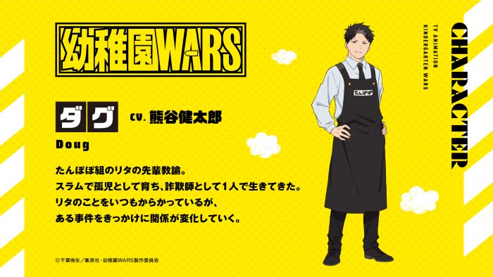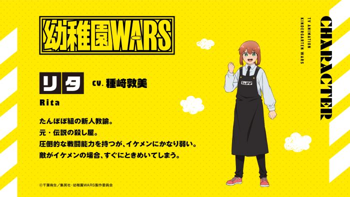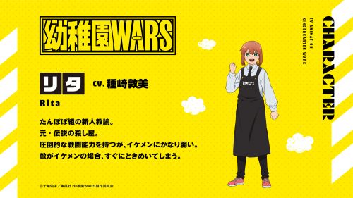 2025.12.20 ティザービジュアル&ボイスコミックPV公開! ジャンプフェスタ2026 『幼稚園WARS』ステージにて ティザービジュアル、キャラクタービジュアル、メインスタッフ、ボイスコミックPVを公開いたしました! ぜひご覧ください! 🌟ティザービジュアル 🌟リタ&ダグ キャラクター紹介 🌟メインスタッフ 原作:千葉侑生(集英社「少年ジャンプ+」連載) 監督:五味伸介 キャラクターデザイン:山中純子 制作:サンライズ 🌟ボイスコミックPV リタ:種﨑敦美 ダグ:熊谷健太郎